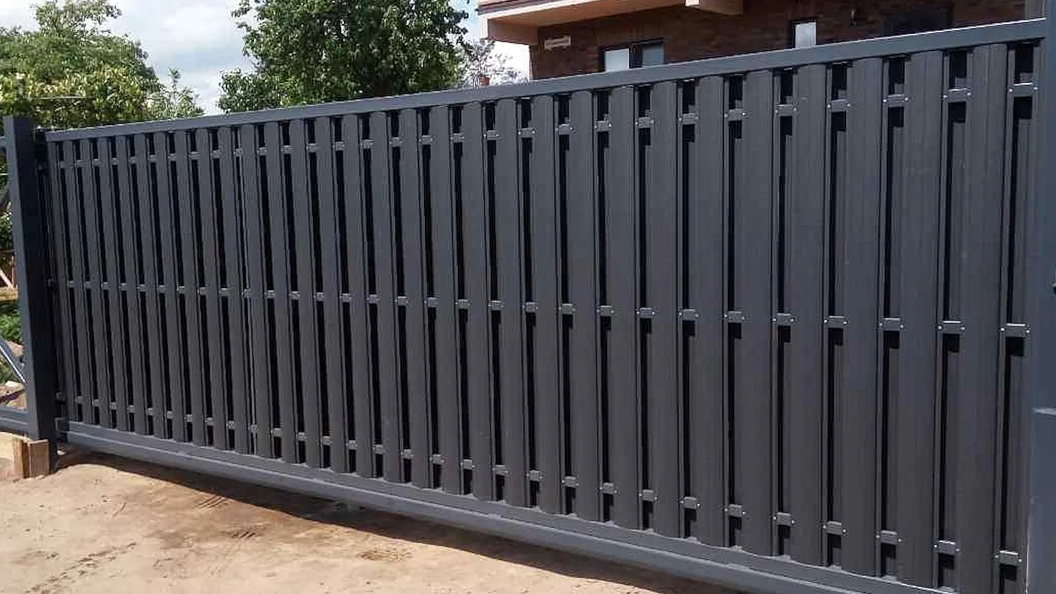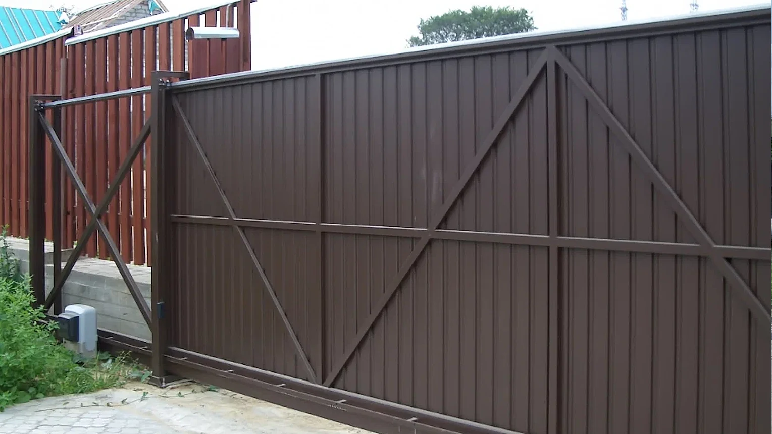 Откатные ворота из профнастила с встроенной калиткой и автоматикой